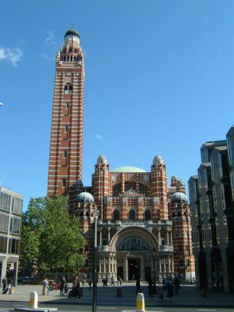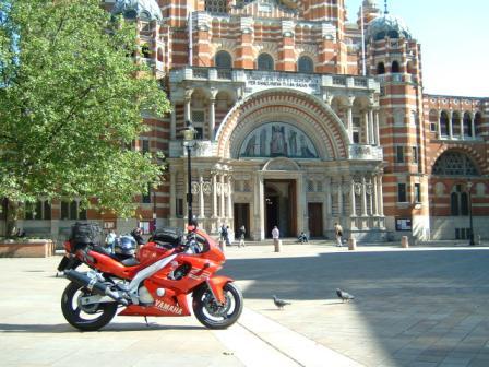 Very straightforward ride from St Paul's thanks to St Ken Livingstone's Congestion Charge (bikes exempt). Pulled on to paved area ("piazza" - very catholic-sounding term) in front of cathedral for photo, then parked up against west wall. Bad idea - got a parking ticket from Westminster City Council! Extraordinary edifice; must have been truly revolutionary when first built (1903). Red and yellow bricks giving appearance not unlike corned beef, with tall, slender bell tower.