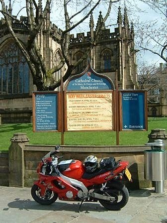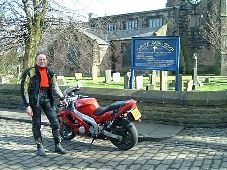 Called at Radcliffe, near Bury, afterwards. Parish church is dedicated to St Mary. Took picture of bike by notice board of course!