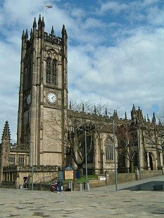 Wot no rain in Manchester?! Sunshine indeed... Large former 15th century collegiate parish church, upgraded to cathedral status in 1847 when diocese formed. First bishop was Australian born, so bishop's throne (Greek kathedra, hence cathedral as the name of a church which contains the seat of the diocesan bishop) has two prominently carved kangaroos. All windows were blown out during WW2 blitz, and replacements include some excellent examples in vivid colours.