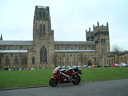 Awe-inspiring Norman (Romanesque) edifice. Nave, quire and transepts were completed by 1133. Fantastic massive columns, deeply engraved with geometric patterns, supporting roof of nave and quire. Given special dispensation to park bike on Palace Green for photo; greeted by steward with "Are you The Vicar?"! Stayed for Evening Prayer (sadly no choir during Easter Week).