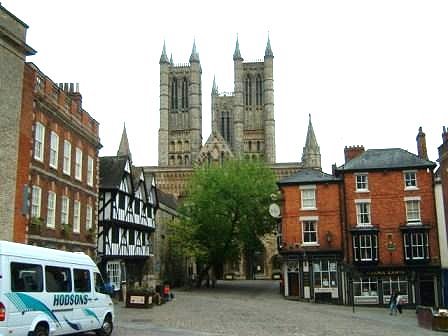 "A city which is set on a hill", said Jesus, "cannot be hidden". Approaching Lincoln from the south-west the cathedral dominates the view, massive and majestic. In the 1400s all three towers were topped with spires, making this probably the tallest building in the world. The two west front turrets are crowned with statues - one of St Hugh, the bishop who rebuilt the cathedral after an earthquake in 1185, and the Swineherd of Stow, who gave his life savings of sixteen silver pennies towards the rebuilding. A "widow's mite" indeed - how good that it is so honoured. I couldn't find the roof boss of a man with toothache, but I knew where to look for the famous Lincoln Imp.