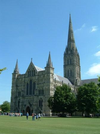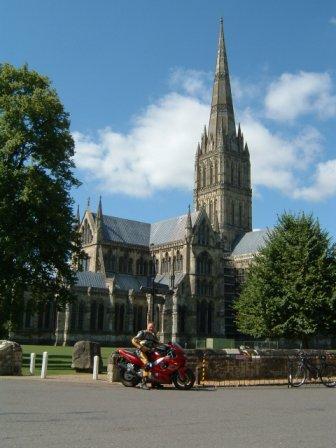 Invited to join the cathedral staff for their morning prayers. Sadly missed it because of heavy rush-hour traffic getting into town, and I wanted to go in convoy with Maureen rather than overtake the queues as I normally do on the bike. But we met them all as they went to the coffee shop and they made us very welcome. Stunning building - well known as having tallest spire in England, but whole cathedral has unusual integrity because almost entirely a single style of architecture ("Early English Gothic" - built mid-1200s). Like Winchester, built as a cathedral - never a monastery - but unlike Winchester, has cloisters, added mid-1300s and the largest in England.