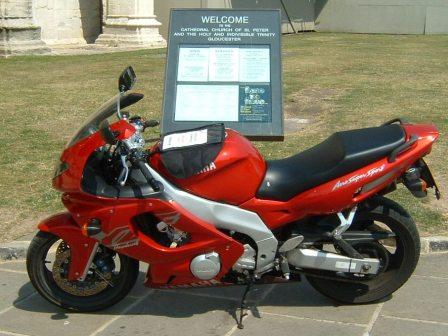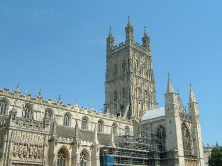 Hotter than ever - in fact the hottest July day since records began... Bearable in leathers at speed, but not so funny in town, looking around for the way to the cathedral. Accosted again - but this time by two girls from Severn Sound local radio station, giving away ice lollies as a promotion. Well, I'm advertising the station now, so I suppose it worked with me! The ice lolly was very welcome... What a magnificent cathedral - former abbey church which became a cathedral in 1542, the abbey having been dissolved in 1539 (same as Bristol). Splendid Perpendicular east end and tower, largely built within the Norman shell, using proceeds from pilgrims who came to visit the tomb of Edward II - cashing in on the tourists as they do now with Harry Potter fans coming to see the cloisters!